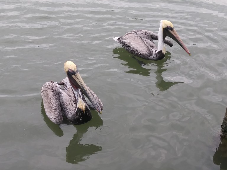 The pelicans closest to me (the camera) are juveniles, which you can tell by their coloring on their heads and necks (gray). Toward the middle of the photo and at the back, you will see two with white necks. Those are adults. They don’t get their adult coloring until they reach the age of three.