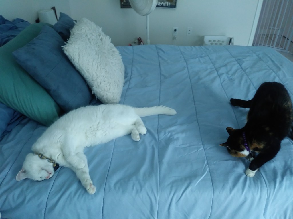 Whereas HoneyBun had been only slightly anemic on Monday, her blood cell count on Saturday was down to 12 percent. The emergency animal hospital vet agreed with me that to let her go would be the kindest thing I could do for her. So I said goodbye. She and Callie’s ashes are right next to each other in my bedroom. I have all of my animals privately cremated these days so they can always travel with me and be with me, no matter where I may find myself. (For those of you not familiar with the term, “private cremation,” there are two types of animal cremations. Private means you get their ashes back. Group cremations means you don’t get the ashes back.”