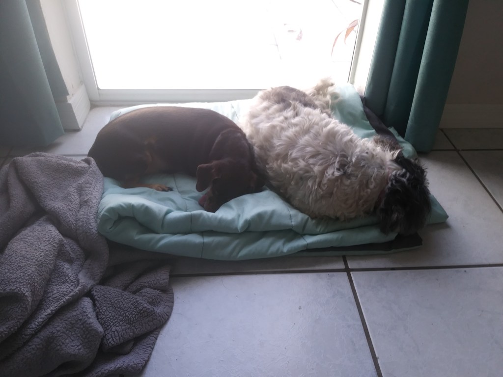 Being able to work from home, I see what they do all day.  They sleep, eat, drink water and poop.  Sophie plays with Steel (my roommate’s German Shepherd, on whom I think she has developed a crush; it’s so cute), but even then there’s a whole lot of sleeping going on.  Even so, I want them to have enough space to feel comfortable.