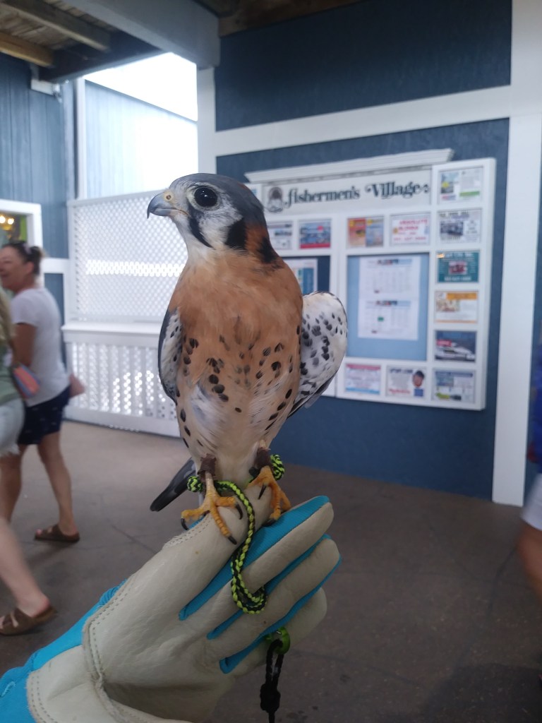 Cruiser is an American Kestrel. Smallest type of falcon in North America. One of the types of birds where the male is more brightly colored than the female (his wings have some blue to them.) Named Cruiser because he was hit by a car and found by a biker who picked him up, put him in his saddlebags and brought him to PRWC. That was about two years ago. He is estimated to be about three years old.