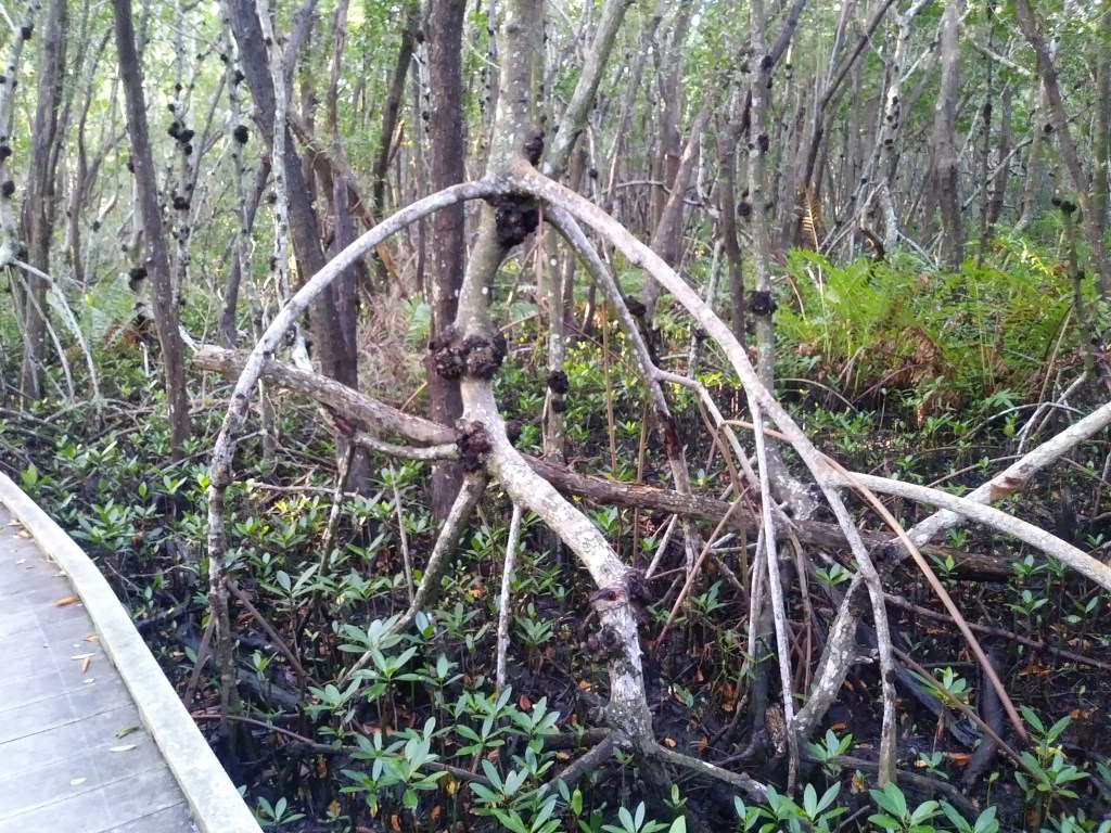Here you can see how well-developed the mangrove tree’s root system is, as well as see many more of the burls mentioned above. While the bark of this tree may not look red, it is very close to the shoreline, so I believe it is a red mangrove tree. So named because its inner bark is red in color.