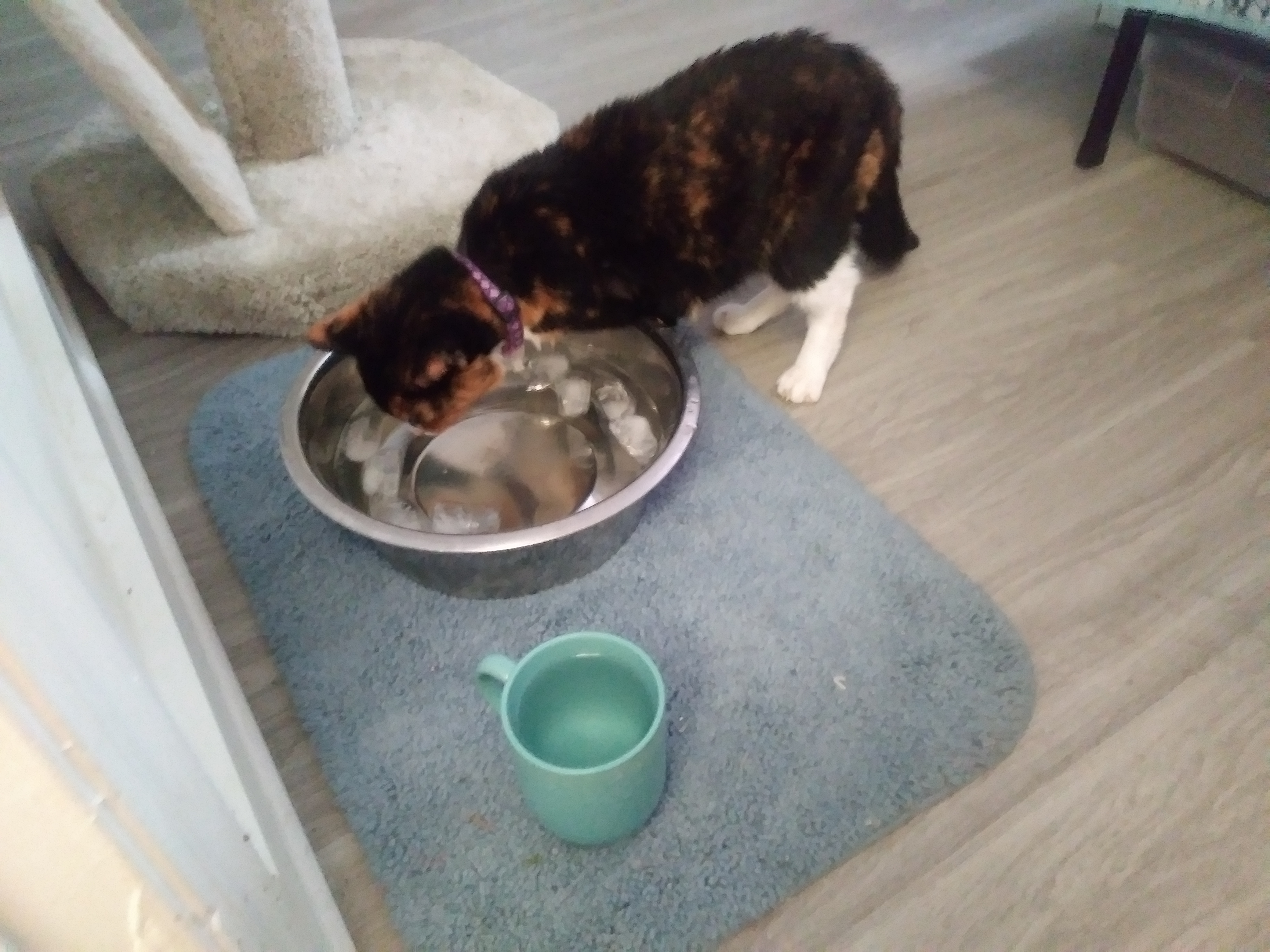And I will close this post with a picture of my teeny-tiny Callie drinking out of a giant bowl of water containing LOTS of ice cubes.