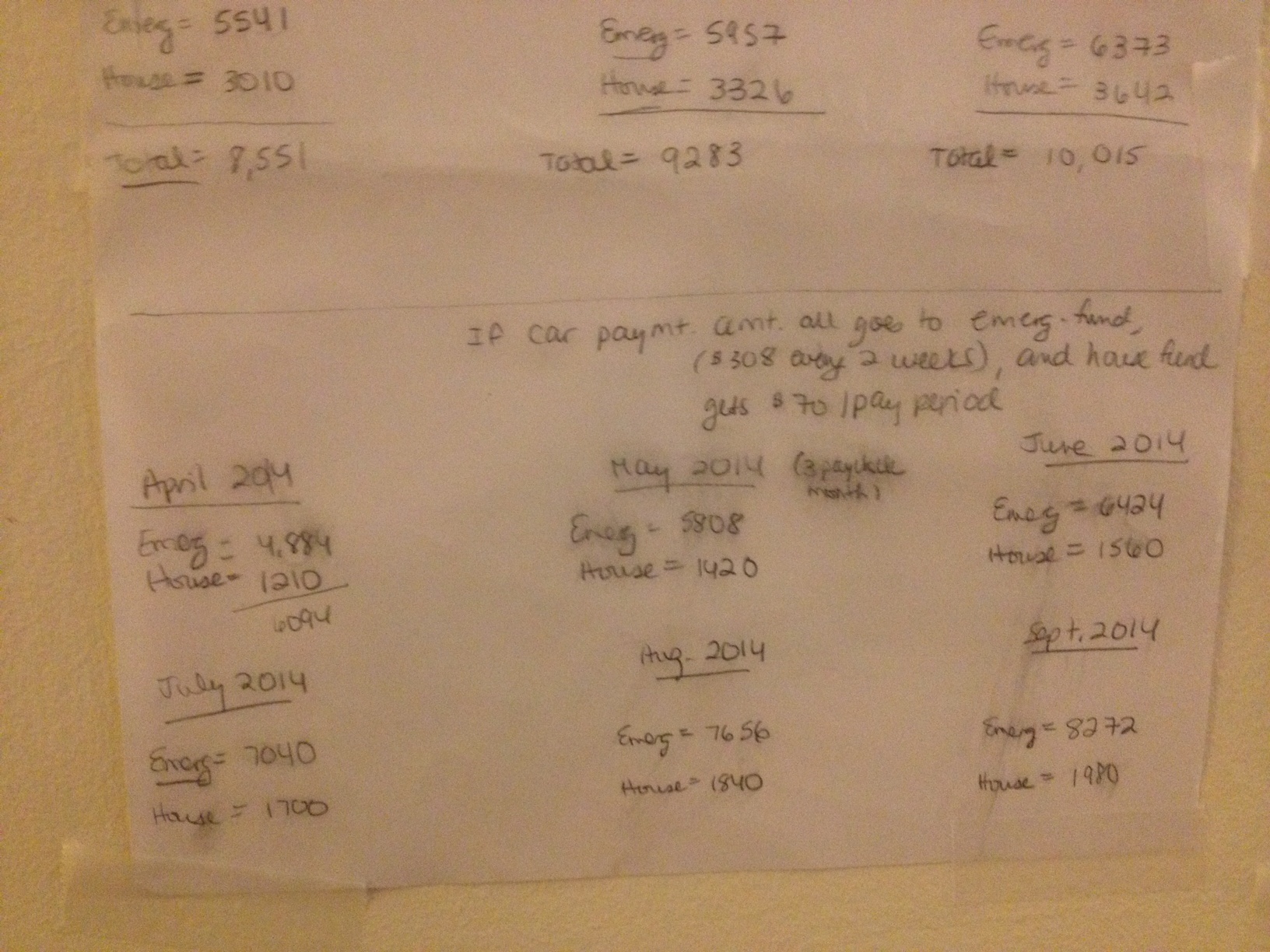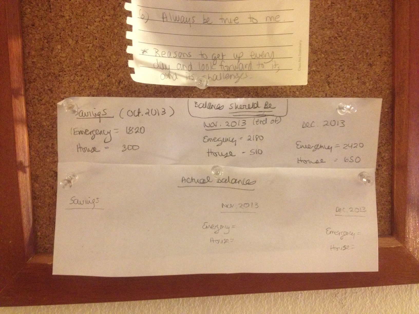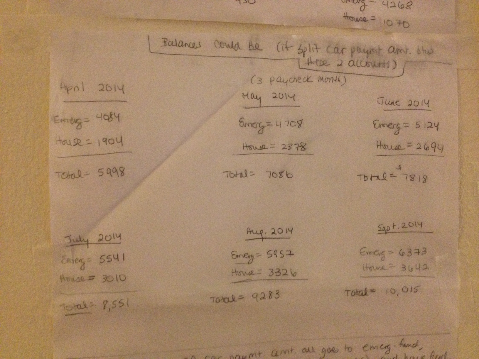 I put them all on my wall and I already feel like I’m making progress. I plan to take note (with various colored pens), as to whether each goal is met on a monthly basis. I am hoping to create a line graph showing my progress, showing the actual balances as compared to the “should be” balances. With any luck, those lines will literally be on top of each other.  I’m definitely a visual person, and they always say writing things down helps. It totally does.  I also started putting together a graph for the next three years, as I think that is now my goal time period in which to make a move. I want to set either monthly or quarterly goals, so I will feel like I’m continuing on my way, and can see measurable changes over time.