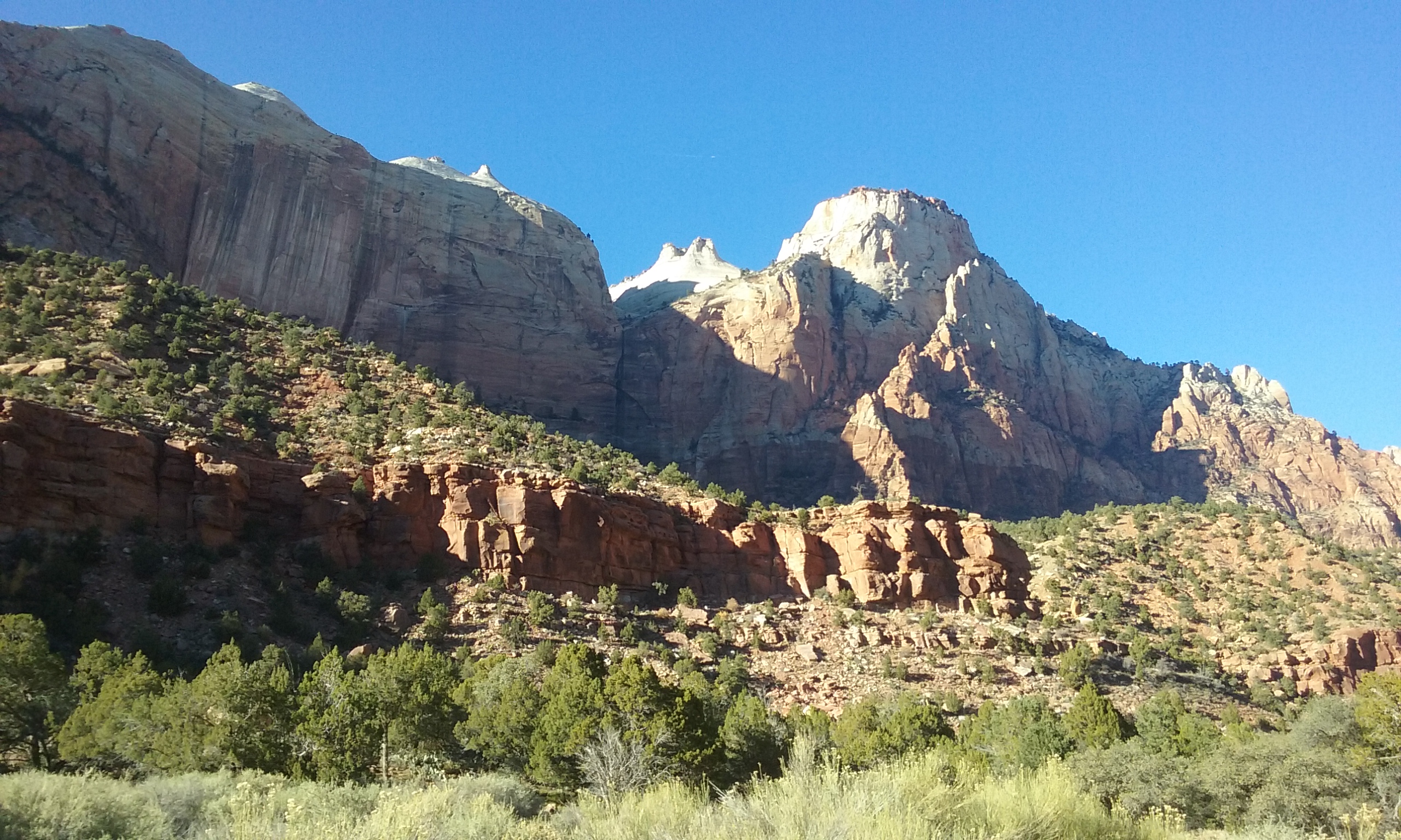 My lunchtime view – close to the Visitor Center at Zion. I *think* that rock formation is called The Watchman because it overlooks the Watchman Campground.